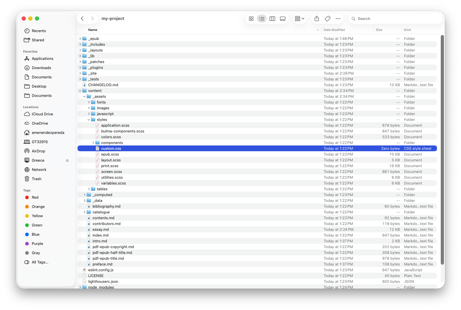 Screenshot of the custom.css file in the _assets/styles/ directory.